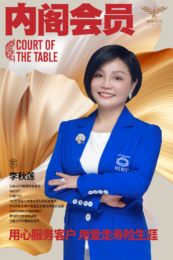 2012年7月从一人开始,成立千人团队,培养最多陆籍总监,年年连续蝉联全国最佳成就第1名 2015-2022年8度全国最佳成就第一名 2015-2022年7度全国副总组第一名 2013-2019年6度全国营业部经理第一名 2021年总经理组25个月继续率第一名 美国百万圆桌终身会员 CMF主管组终身会员 TMC千万圆桌至尊会员 IDA华人龙奖主管组织终身会员 2017年福布斯·RFP中国保险精英 2017-2018年第一财经·RFP中国十佳保险营销团队 2018年成立湘菁公益基金 2019年保险中介领军人物 2019-2021年保险名家至尊大使 2020年福布斯中国保险精英评选暨中国保险大会评为《年度卓越团队》 2020福布斯中国保险精英评选为《年度卓越团队》 2021百人保险名家团队,全国只有三个团队入围。 著有《点睛》、《征峰》两本畅销 书籍联合出版《出谋画策》财产规划与保险籍 网点遍布上海静安,苏州湖东,昆山前进