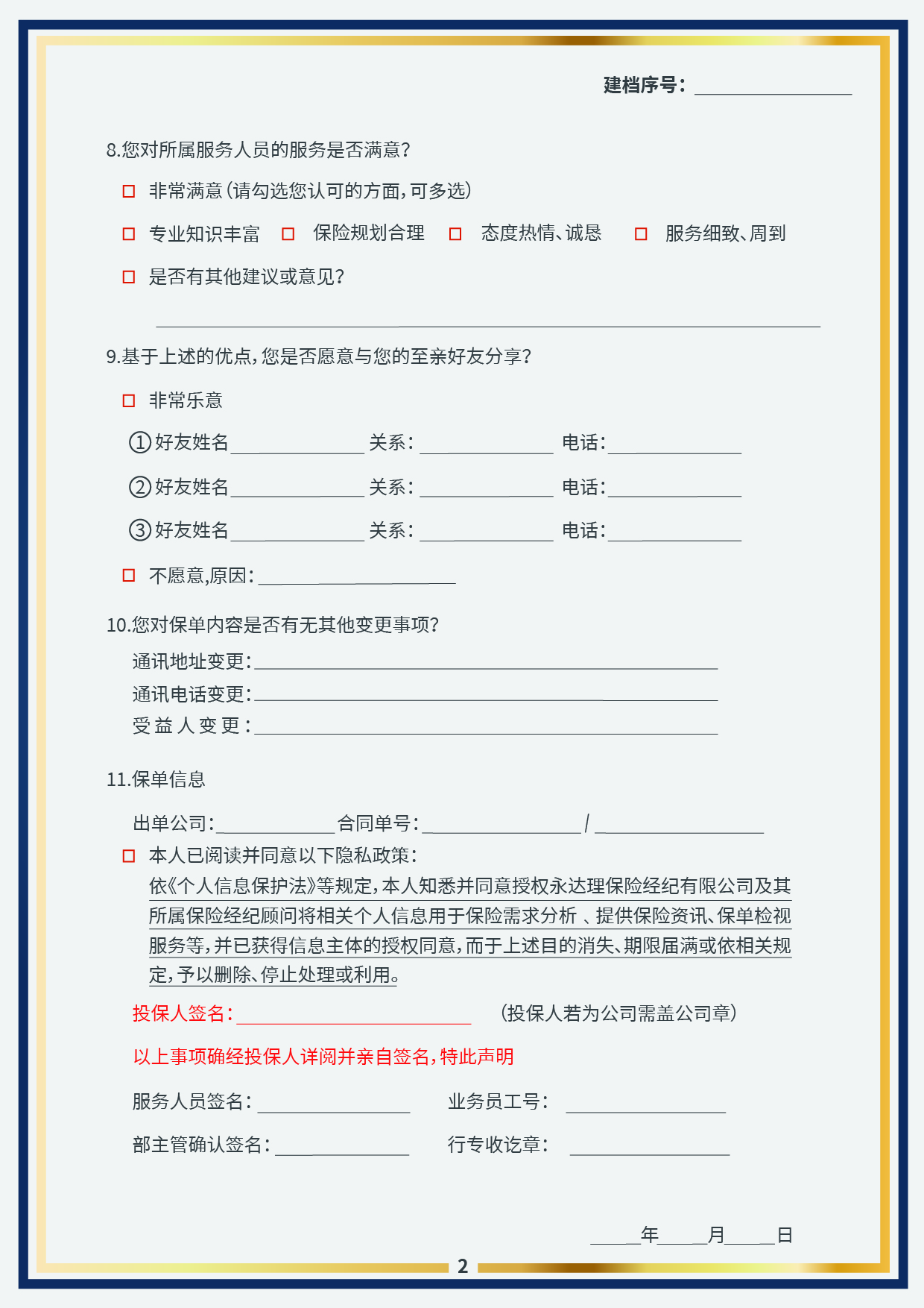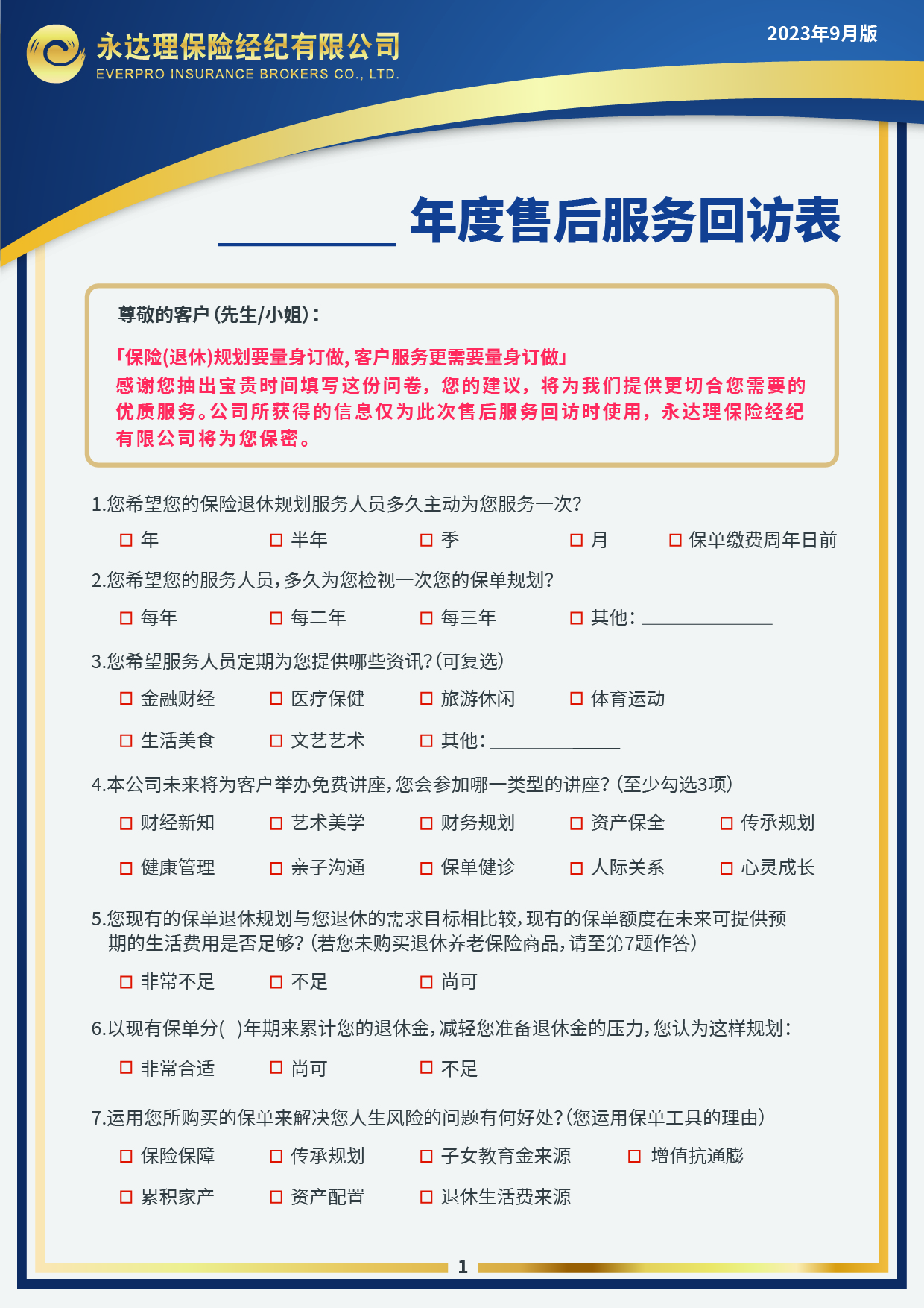 售后服务回访表是永达理用于了解客户售后需求、改善服务质量的重要参考依据。公司要求服务人员为客户提供完善的售后服务,且每年需签回售后服务回访表。通过客户的反馈切实了解客户实际需求并做出积极调整,例如服务周期、客户感兴趣的咨询内容以及对于服务人员的评价等。对于接续客户,我司要求接续服务人员必须亲见客户签署售后服务回访表。使客户在接受服务的同时更能感到被重视、被关爱,从而提高客户满意度。