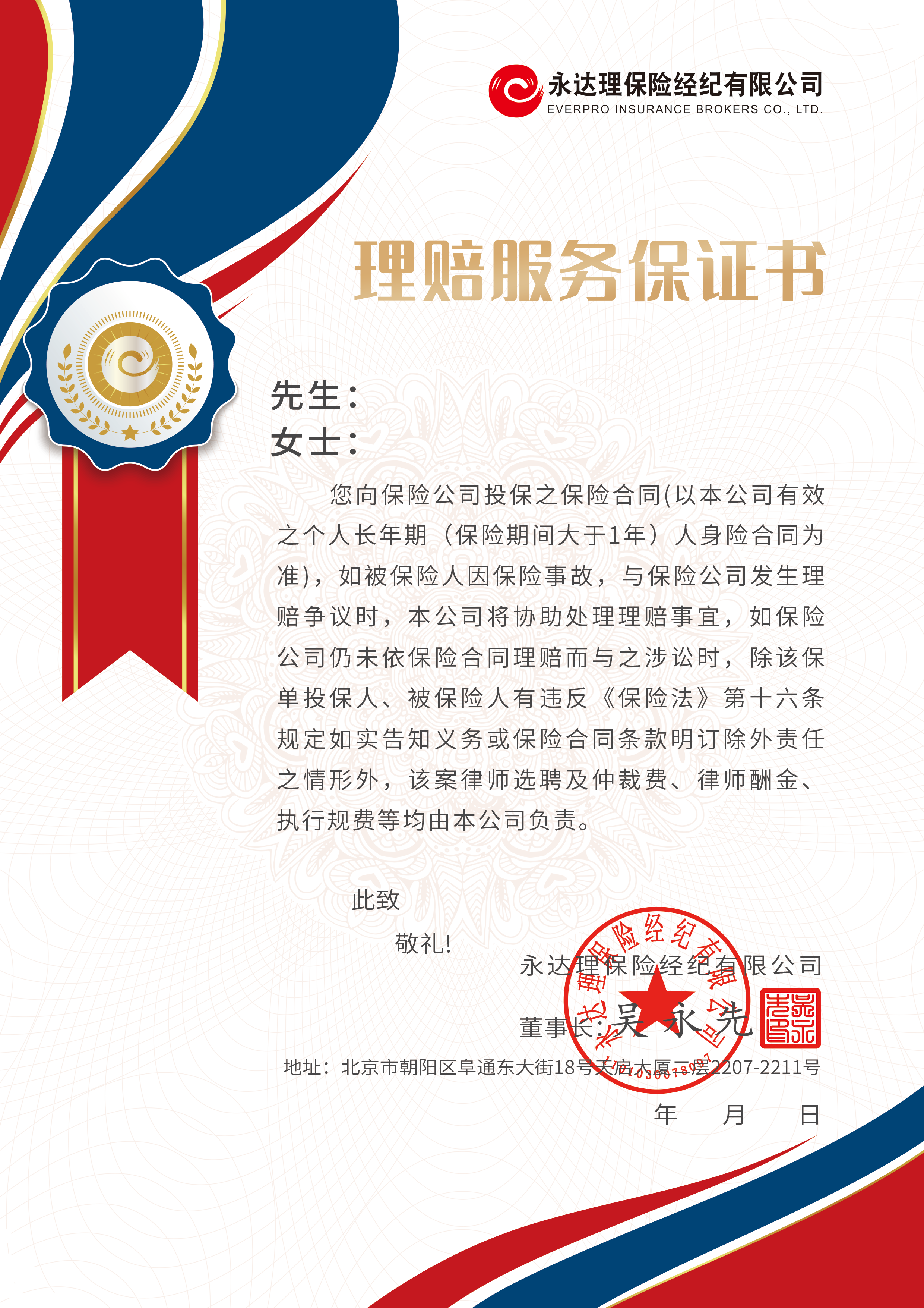 永达理向客户送出的每一份个人长年期(保险期间大于1年)人身险保障,都会附带一份《理赔服务保证书》,以保证投保后在发生理赔争议时,最大程度保障客户利益。