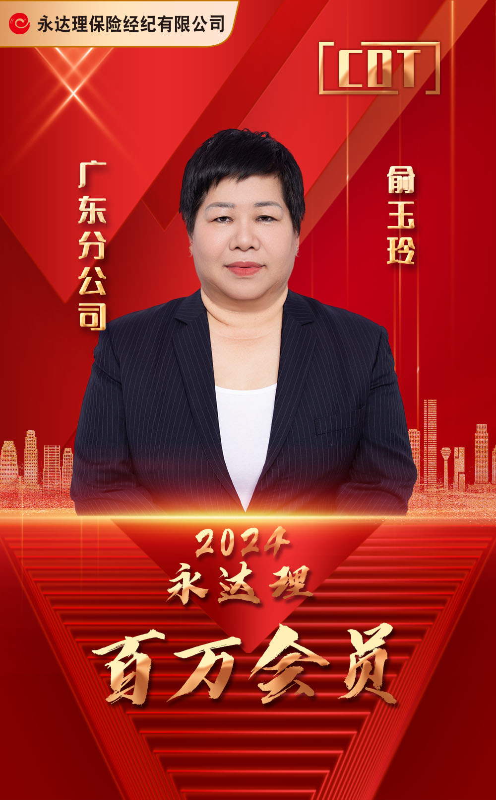 进入永达20年,见证着永达的成功,团队的成长,人才的涌现。乘着台湾永达的[西进计划],2015年7月,带着一个使命来到大陆,来到永达理,来到广州。“一人做保险,全家不要脸”是大陆保险业的既有印象,但是我一直认为大陆保险业务员的地位不应该是这样。我们要用台湾永达成功的经验,百万会员的企业文化,可复制的培训系统,扭转这个局面。带人首需带心,所有同仁将士上下一心,历世磨鈍,坚持不懈地深耕这一块园地,并创造出灿烂辉煌的业绩。面对未来竞争激烈的保险市场,我有信心将版图扩展至中国大陆市场,强化销售上的优势,帮客户做好退休、资产保全等的完整规划。真正的领导者知道沟通的价值,以「机智」「有行动力」,「以身作则」,为动力,引导团队自动自发的朝向共同目标努力。使命必达,任重道远,对于未来如果你有所期待,那么请你准备好行囊,扬帆起航,并创造出属于你我缤纷瑰丽的远景。