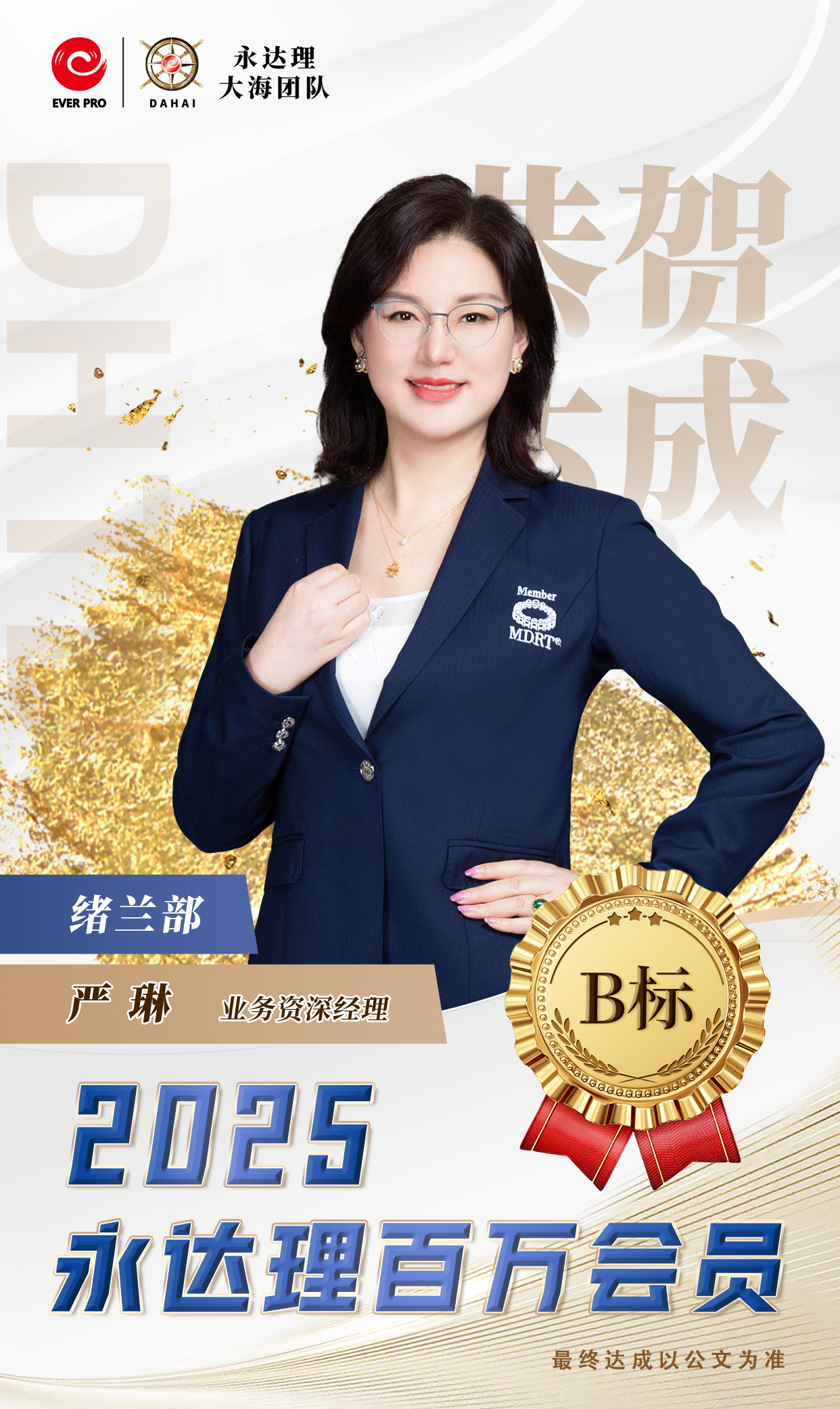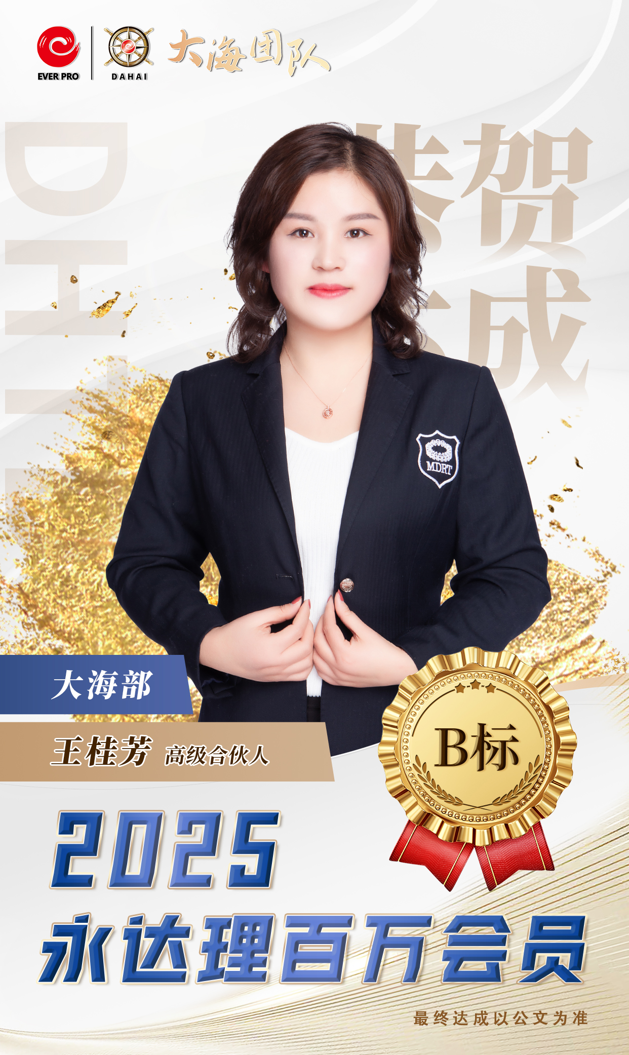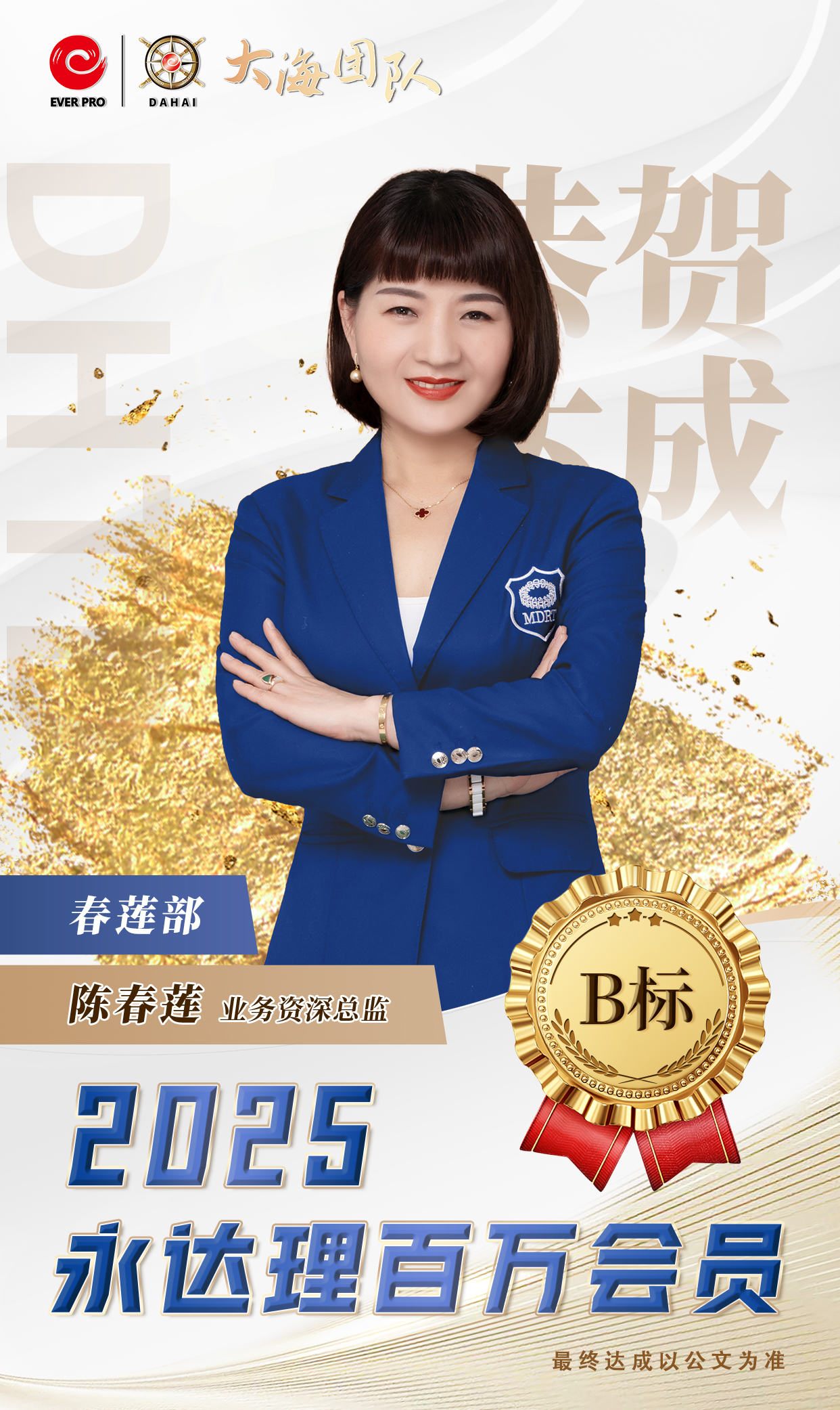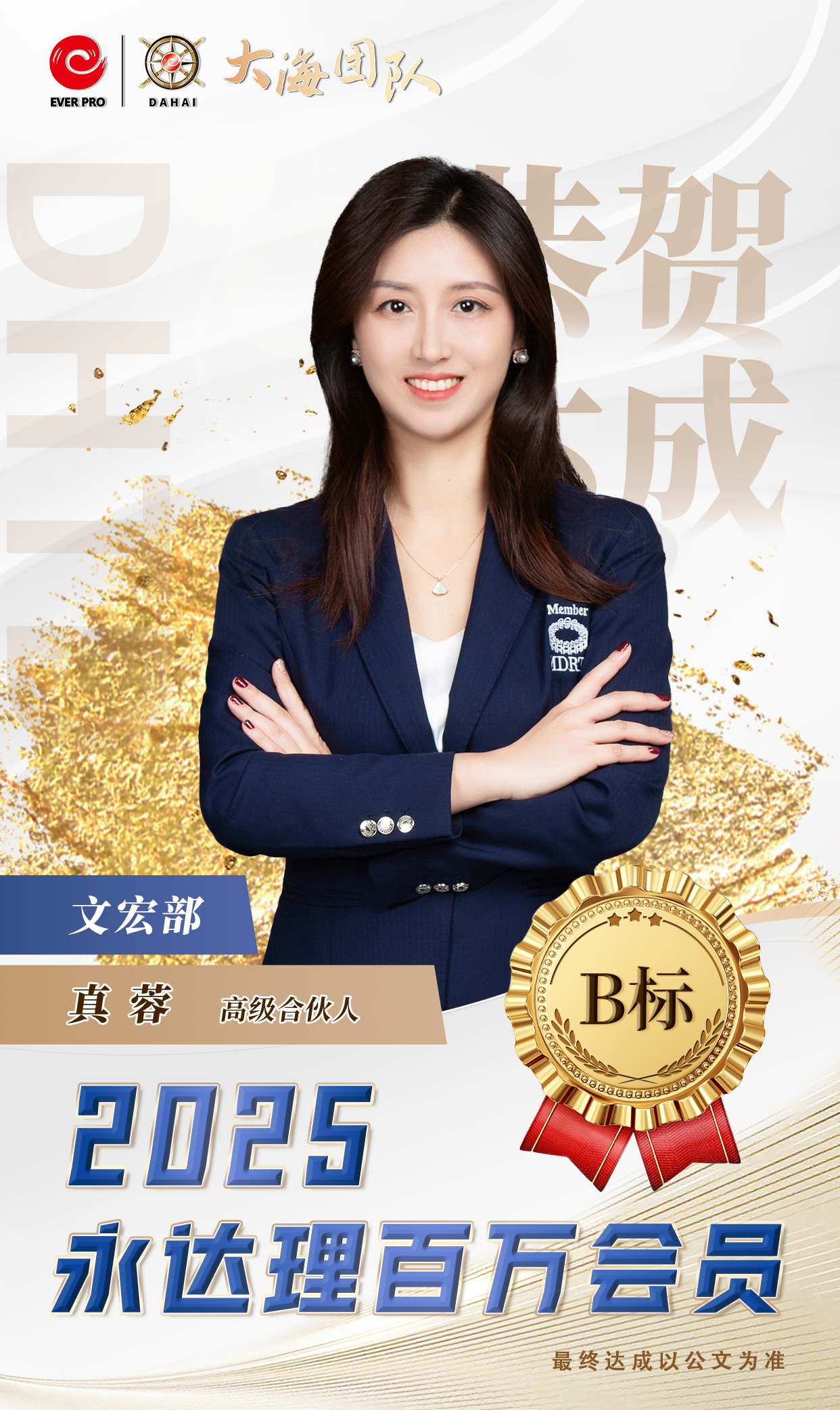 永达理江苏创始人 业务总经理 IMA保险名家中国区常务副主席 苏州园区台协常务副会长 永达理大海团队公益慈善基金创始人 比利时商学院工商管理硕士 FCHFP财务策划师 AIA国际会计协会会员 RICH达人杂志-创办人 台湾商业周刊-王者认证 TRFP财务策划师 (第一届财务个案教育奖) 2022《中国银行保险报》中国寿险专业中介营销先进管理奖 2020福布斯年度十大人气讲师 2018中国保险杰出领导力奖 2019中国保险中介领军人物 拥有国际专业认证 百万会员,IDA,CMF 三项终身荣誉会员 IMA2022荣誉大满贯 达成2022IMA保险名家百人团队 CMF百人星奖团队长 TMC 千万圆桌-至尊会员, 保险名家-至尊大使 福布斯中国保险精英-钻石奖 连续7年CMF钻星主管奖 辖下组织1,500人 辖下培育永达理百万会员超过2,500人次。 座右铭:除非太阳不升起,否则没有无法超越的梦想。 畅销著作:《锣声吶响》、《从无到有》