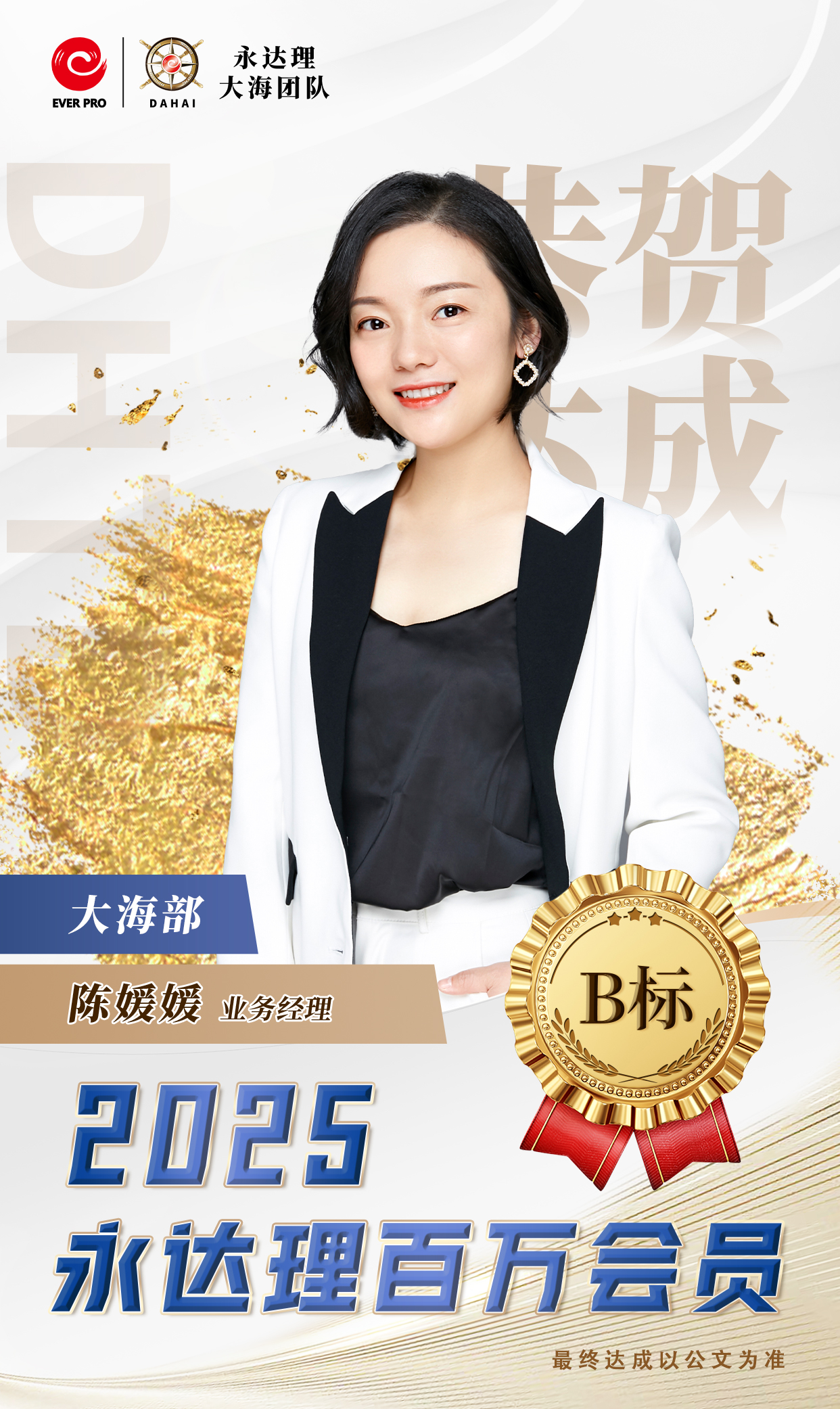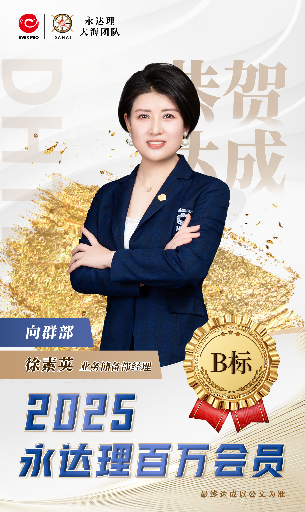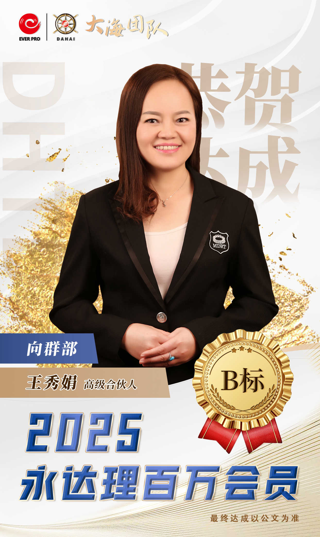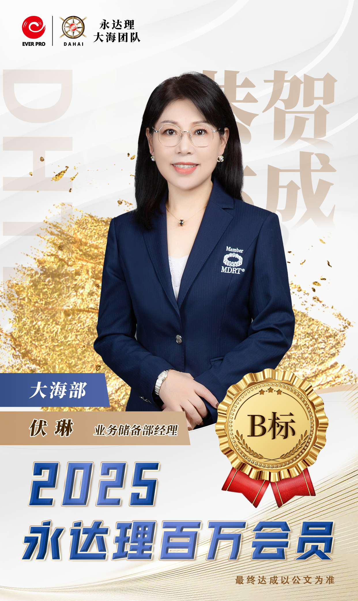 永达理江苏创始人 业务总经理 IMA保险名家中国区常务副主席 苏州园区台协常务副会长 永达理大海团队公益慈善基金创始人 比利时商学院工商管理硕士 FCHFP财务策划师 AIA国际会计协会会员 RICH达人杂志-创办人 台湾商业周刊-王者认证 TRFP财务策划师 (第一届财务个案教育奖) 2022《中国银行保险报》中国寿险专业中介营销先进管理奖 2020福布斯年度十大人气讲师 2018中国保险杰出领导力奖 2019中国保险中介领军人物 拥有国际专业认证 百万会员,IDA,CMF 三项终身荣誉会员 IMA2022荣誉大满贯 达成2022IMA保险名家百人团队 CMF百人星奖团队长 TMC 千万圆桌-至尊会员, 保险名家-至尊大使 福布斯中国保险精英-钻石奖 连续7年CMF钻星主管奖 辖下组织1,500人 辖下培育永达理百万会员超过2,500人次。 座右铭:除非太阳不升起,否则没有无法超越的梦想。 畅销著作:《锣声吶响》、《从无到有》