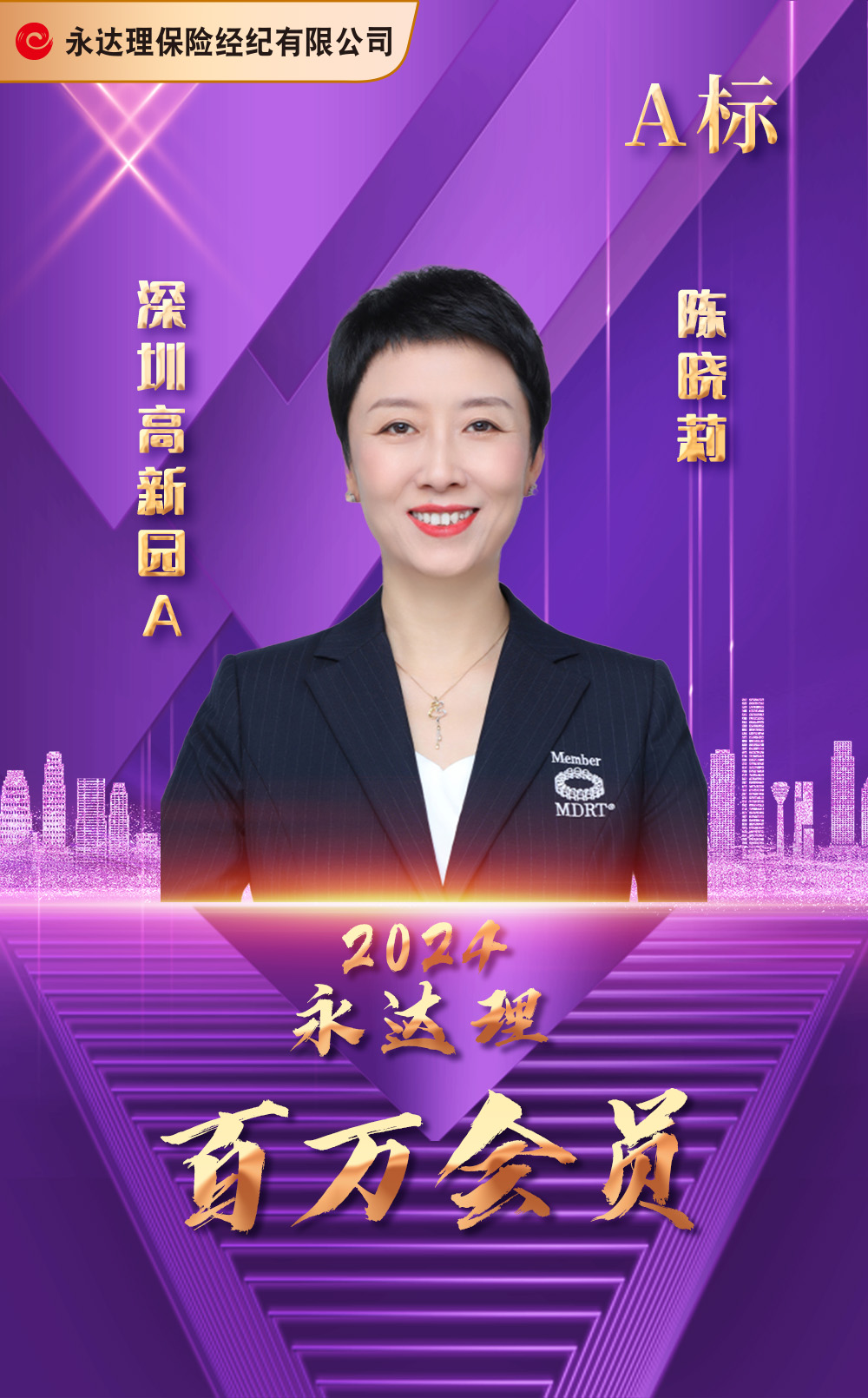 保险年资32年,培育永达理百万会员600人次。专长:组织发展管理,建立教练式培训系统,增员系统,销售系统。顾问式行销亚洲认证导师、Disc行为模式分析认证导师、亚洲讲师论坛专任讲师。所获荣誉:2004-2015年国际龙奖优秀主管 (金龙奖1届、银龙奖3届、铜龙奖7届) 2012-2022年中国保险之星 金星主管会员 2019年中国保险名家 白金奖 个人成绩:永达理聚富团队创始人;永达理“一周即时财经讲座”创办人;育成4位副总、8位总监、4位筹备总监;发展出5个营业网点